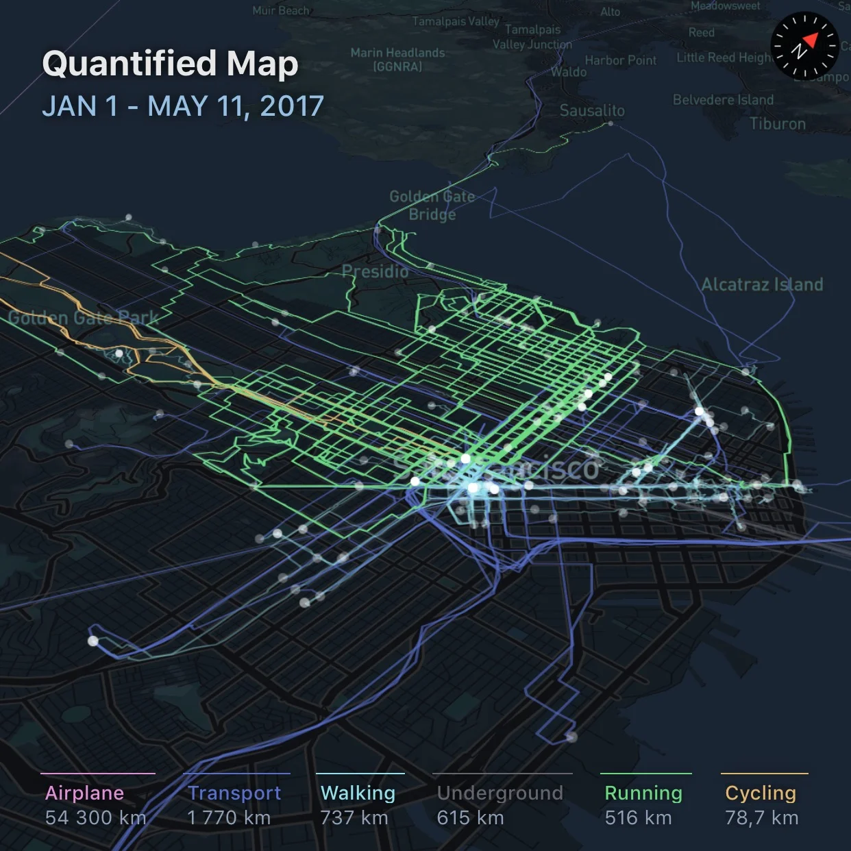 Quantified Map is a free iOS app to keep track of your activity and travel through the years. Create high quality personalized maps using your data, visualize your day to day timeline, compare your workouts and annotate your photos to find them easily.